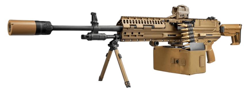 The SIG LMG is a gas-operated, short recoil, belt-fed, select-fire weapon with an overall weight of around 15 lbs (6.6 kg). It typically feeds from 50 or 100 round belts carried in quick-mounting pouches. It has a side-hinged feed tray and uses a hydraulic buffer recoil mitigation system with the combination of its moving barrel assembly and a hydraulic buffer mitigating felt recoil. Calibre conversion to 7.62×51 can be done with a barrel change and it can also be chambered in 6.5 Creedmoor. The US Army’s M250 Automatic Rifle does not currently have a quick-change capability as it does not have a carry handle on the barrel, in an effort to save weight, but the LMG does have a carry handle. While the M250 has a fixed stock the the LMG can be configured with a side-folding stock.