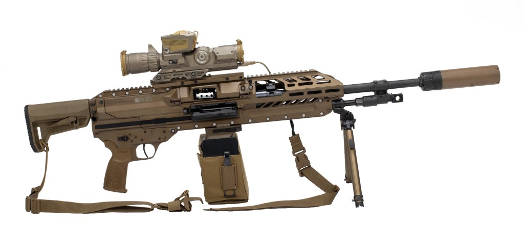 SIG’s other machine gun, the SIG MMG, in .338 Norma Magnum, and SIG LMG represent SIG Sauer’s first foray into belt-fed machine guns. The .338NM chambered SIG MMG was developed following a US SOCOM request and SIG Sauer leveraged the same technology and design elements in the LMG when the US Army launched the NGSW programme in 2019.