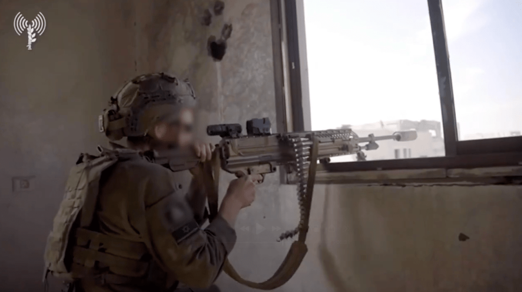The same officer is quoted as saying: “Fighters who have experienced the new machine gun in Gaza told me – it is more accurate than our marksmen, and sometimes even than the snipers. It is a tool that makes the difference.” Around the same time the IDF Spokesperson’s Unit shared an image of a SIG MMG mounted on a tripod, firing from inside a building. It is seen equipped with a Trijicon 6×48 ACOG.