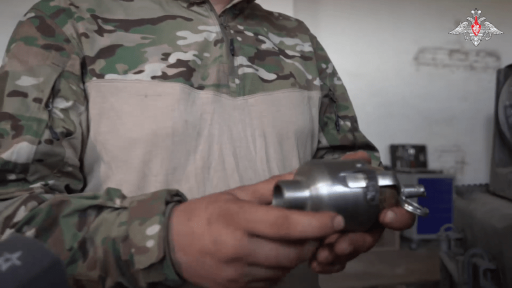 Most recently, on 11 August, the Russian Ministry of Defence shared a short video featuring a Russian Army engineers who are manufacturing 82mm Mortar round conversions for launching from RPG-7s and also cup dischargers for AK-74 pattern rifles. The design is identical to those seen previously. The engineer explains they are made on a lathe and the grenades are launched by a blank cartridge. In the clip we can clearly see that again there is a metal band which the grenade’s safety lever is slid.