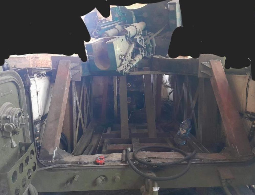 In March 2023, a number of photographs and videos emerged of Russian MT-LBs which had been fitted with a large turret complex over the rear portion of the vehicle. The turrets are naval 2M-3s which mount a pair of 25mm 110-PM autocannons. The first images surfaced at the beginning of March. The strikingly ugly turret quickly led to ridicule on social media and numerous memes mocking the vehicle. Between the 8 and 10 March a series of short videos showing the turret-adapted MT-LBs on the move. One video showed several vehicles in a yard with a large crane, perhaps suggesting they had been off-loaded. The person filming the video notes that the unusual turrets and were apparently ‘sent for defence’. The footage features at least five turreted-MT-LBs, one appearing to also have an adapted front commander’s turret.