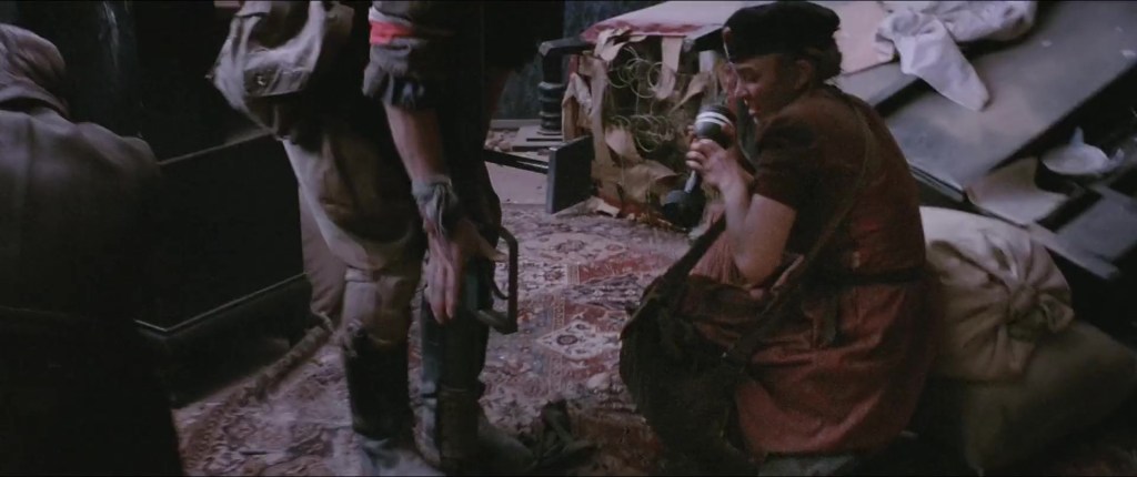 What’s so special about this scene is that it depicts the cocking of the PIAT! As the others open fire the PIAT number one can be seen rotating the outer casing to unlock it and then pulling it up until the spring inside is cocked. He then lowers the casing and locks it ready to fire. We don’t see it but the No.2 has loaded a bomb into the bomb support tray and the No.1 places the monopod on the sandbags and takes aim.