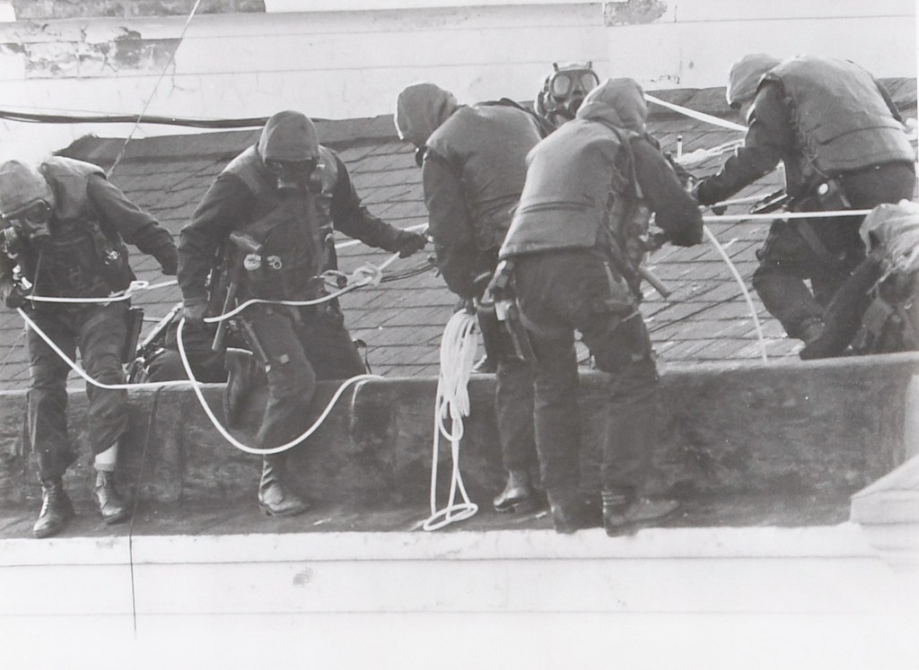 The best photographs are of part of Red Team as they breach the rear balcony of the embassy. In the first photograph a four man team prepare to rappel/abseil down the rear of the embassy to enter via the balcony. You can see the trooper with his back to the camera about to rappel has a Hi-Power with an extended magazine. Subsequent photographs of the four man team on the rear balcony show that several of the troopers have extended magazines. In another photograph Rusty Firmin and a breech team with Blue Team enter the rear of the embassy at the ground floor. On his right leg Firmin is carrying a Browning Hi-Power with an extended magazine.
