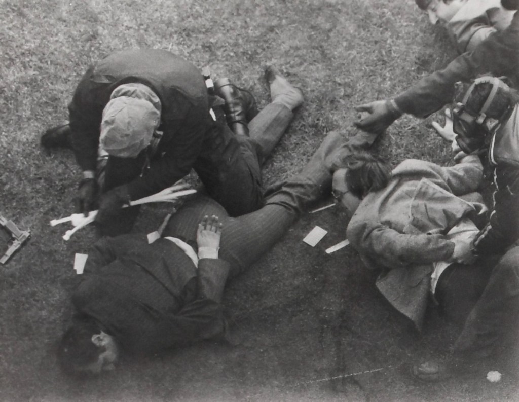 The last photograph shows members of the SAS in the garden behind the embassy securing the hostages so they can be safely identified. As one of the troopers is zip-tying a man he has laid his Hi-Power on the grass next to him.