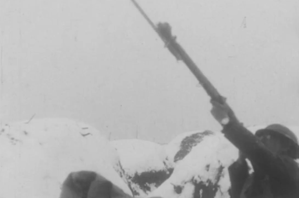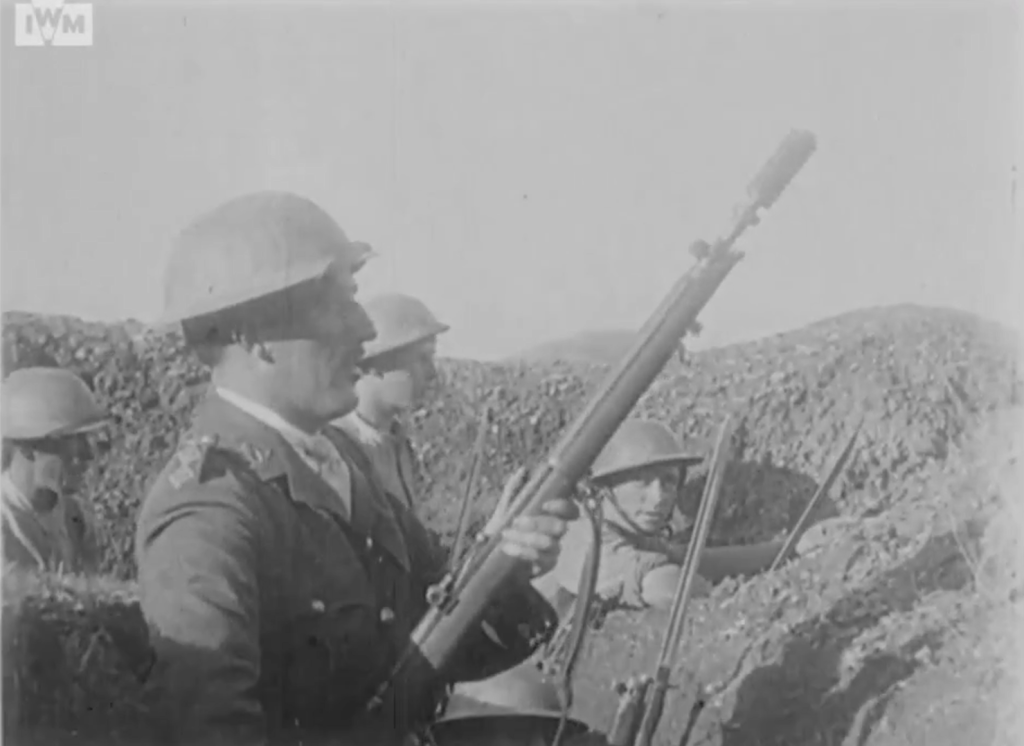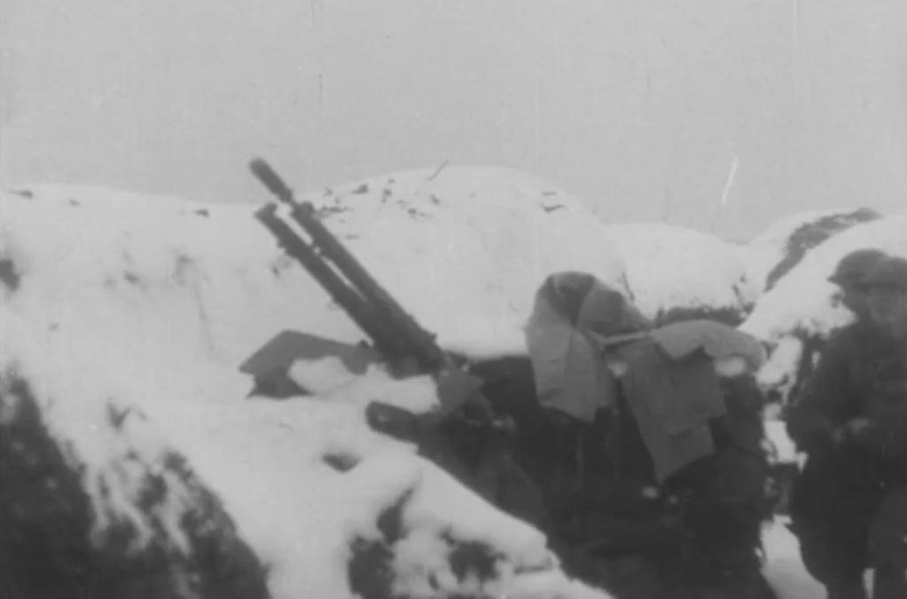 A front view of the weapon, showing the slit from which projectiles fired through, and a better look at the operator’s face (Pathe)