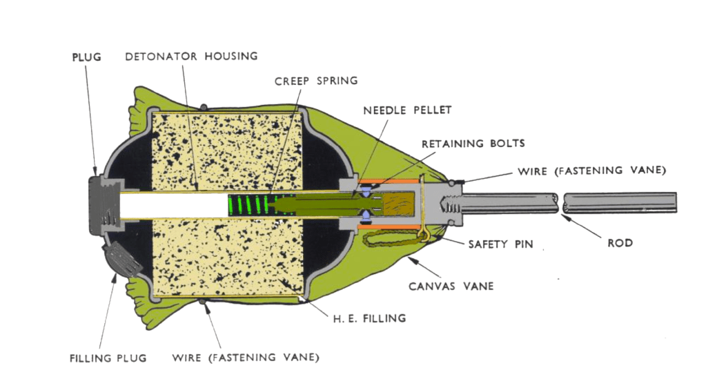 The ignition system was essentially a .297/230 cartridge case and a detonator. On firing a release socket moved to allow the retaining bolts to release the striker (or needle pellet) it had been retaining. The striker was then simply held back from the detonator by a spring. When the grenade struck its target inertia cause the striker to over come and compress the spring, allowing the striker to ignite the detonator and set off the grenade’s main filling. Given mass of the bomb and the type of detonator used the No.44 was probably intended for use at very short ranges.