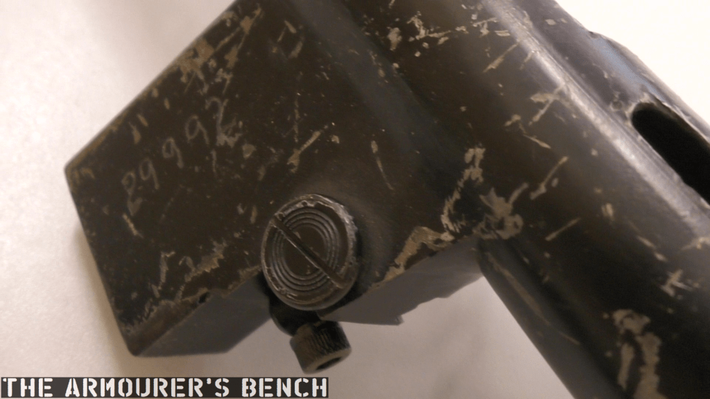 Another difference is the absence of a bayonet lug on the left side of the barrel shroud, and a much cruder fixed sight sat within a U-shaped piece of metal welded to the tube receiver – to act as a front sight protector. The factory-made Sterling’s front sight is adjustable and the sight protectors are folded forward and aligned across the tube receiver. The rear sight and its protectors appears to have sheared off at some point. The only marking on the weapon, ‘29992’, is crudely electro pencilled on the top of the magazine housing, where you’d normally see markings saying ‘Sterling Mk4’ or ‘L2A3’. When that crude serial number was added is unclear. The black paint on the receiver is wearing thin and we can clearly see some file marks in places.
