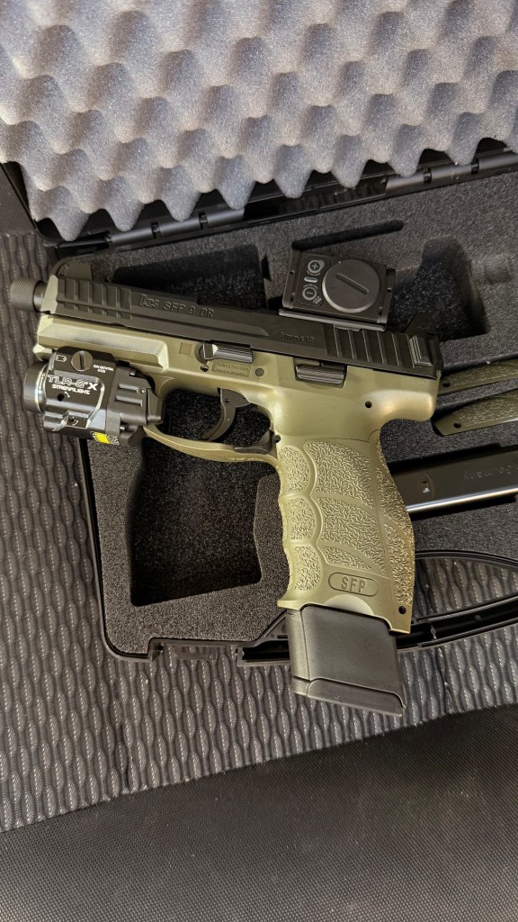 As early as March 2023, the German government announced its intentions to provide Ukraine with 500 HK SFP9 pistols. The delivery of this first batch of pistols was announced on 16 March. Despite this I haven’t been able to find visual evidence of the pistols presence in Ukraine until February 2024, when a photo of a SFP9 OR – or ‘optics ready’ pistol was shared by a combatant. The pistol has an Olight weapon light and a red dot.