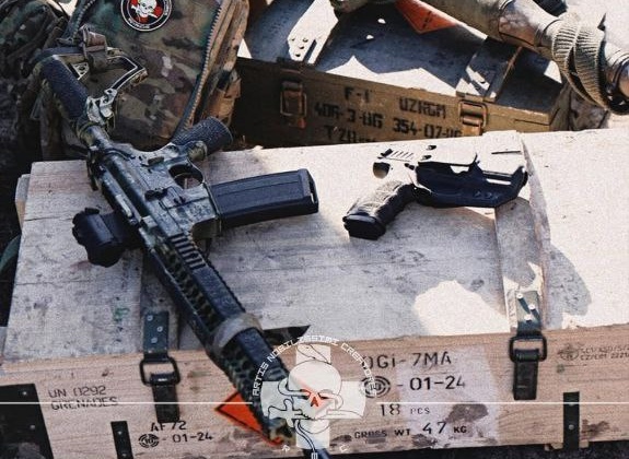 On 6 April, a member of the GUR’s Revanche Tactical Group / Advanced Combat Group shared a photo showcasing a host of small arms from their armoury including new HK433s, HK416s, a UAR-10, CZ and Glock pistols and a pair of HK SFP9s.