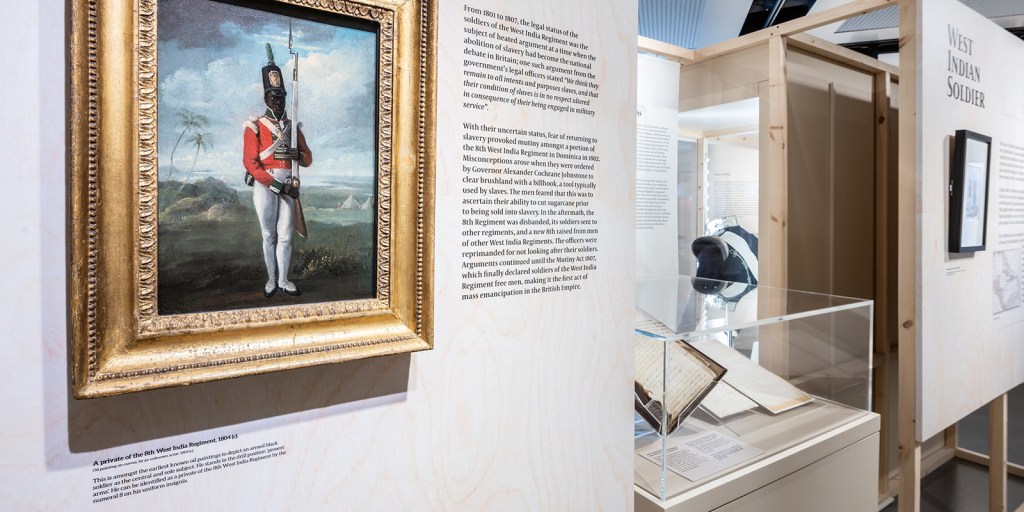 The exhibition explains that the West Indian Regiments were formally a part of the British Army and not a colonial unit or militia. It does not side step slavery’s role in the West Indian regiments‘ history with various letters from the 1760s through to the 1800s illustrating how slaves were bought to fill the regiment’s ranks. Some 13,000 newly enslaved men were bought over 50 years up until 1807 and the British abolition of slavery.