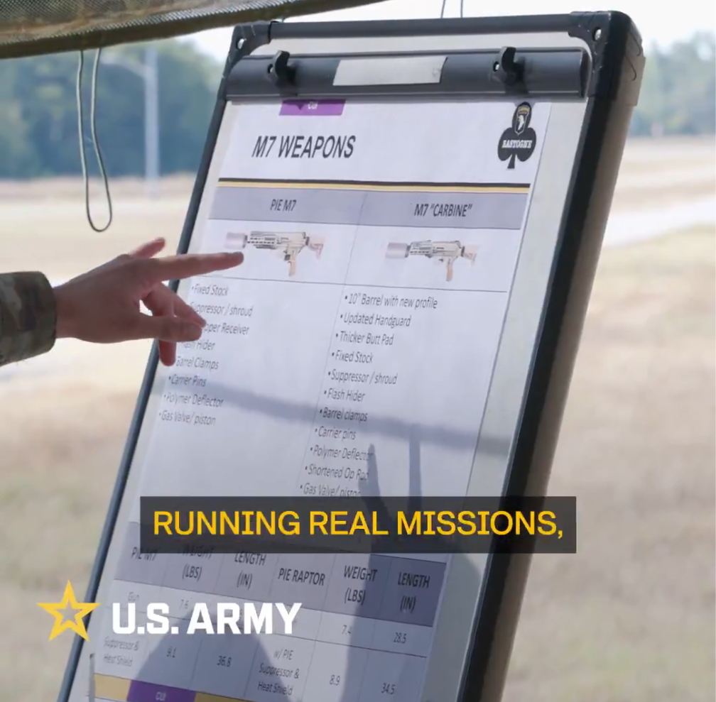 A social media video shared by the US Army highlighting a visit by the Secretary of the Army to the 101st Airborne included a brief shot of a board that offered some details on the “M7 PIE” and the “M7 ‘Carbine'”. (H/T to @TangirayL) PIE standing for ‘Product Improvement Effort’.