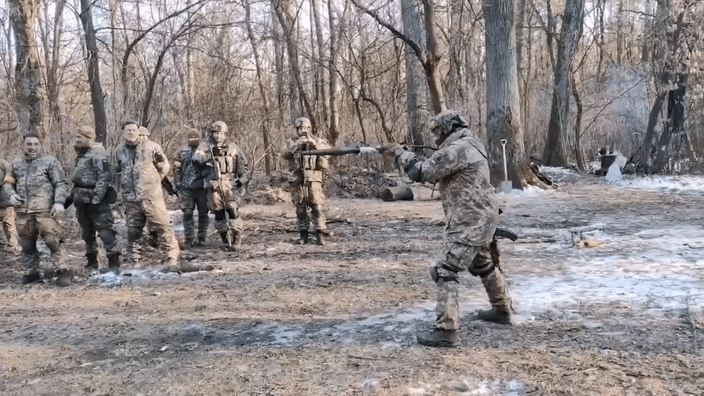 The Ukrainian combatant then launches the RPG-Shovel at a high-angle. Its unclear what sort of range was achieved with the shovel’s aerodynamics being terrible. Sadly, the camera operator’s reasonable caution means that the actual launch is partially obscured but just enough is visible. It’s probably not the first time a shovel has been launched from an RPG, but it is probably the best in terms of close-ups and detail. Regardless, its seems to be a great example of bored soldiers finding amusing, ‘productive’ ways of occupying their time.