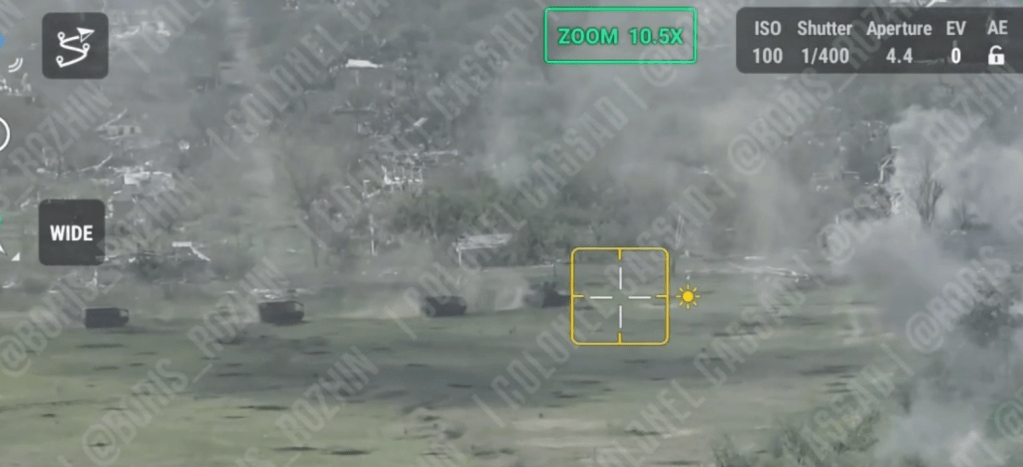On the evening of 14 May, the 79th Air Assault Brigade shared video of another Russian attack in Novomykhailivka, in Donetsk. This showed several intriguing vehicles including a hybrid-turtle which had a layer of tyres under some cage armour and a camouflage net. [Additional footage here] Another brief shot showed a tank, with no visible main gun, moving across open ground. It is equipped with a KMT-7 mine roller and a counter-FPV shell/shed which is open fronted with no additional protection such as a chain curtain or wire cages. It appears the assault was met with both artillery and FPVs.