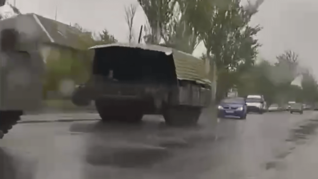 On 20 May, a Ukrainian telegram channel shared a video of another ‘Turtule Tank’, again with no visible main gun but with the usual trapezoidal sheet metal shell. The vehicle has a set of KMT-7 mine rollers and appears to strike two mines while moving at speed. A crew member is then seen running from the tank on foot as another explosion, possibly from an FPV, is seen on the left side of the tank. It is claimed the video was filmed on 18 May, near Novomykhailivka.