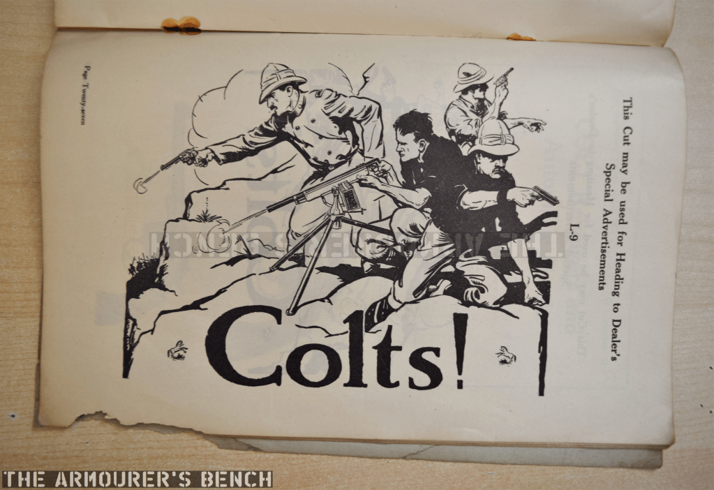 The catalogue includes illustrations of pistols and entire print ads which could be printed locally. It covers most of the commercial Colt line ranging from Colt Model 1908 Vest Pocket pistols, to Colt Police Positive revolvers and Colt’s military automatic pistols.