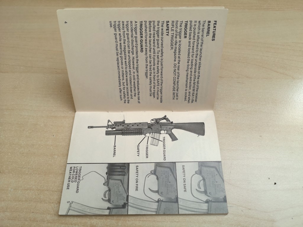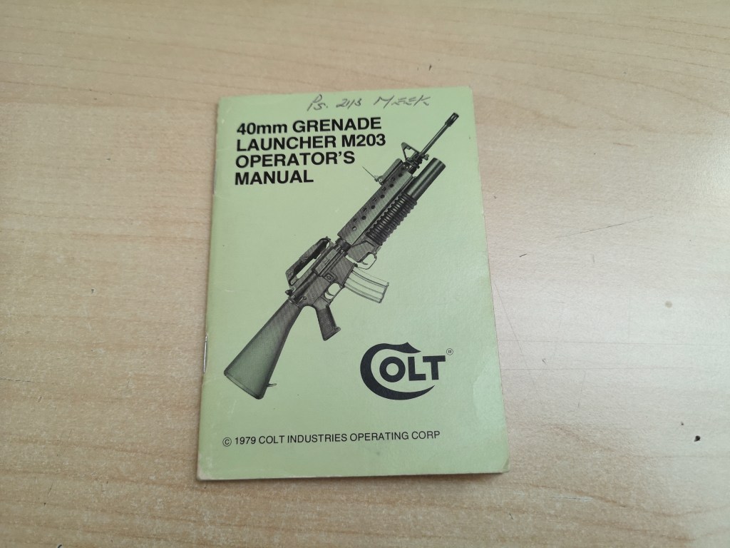 The small Colt M203 manual covers everything you need to know about how to operate and maintain your 40mm grenade launcher. The booklet measures just 5 inches by 3.5 inches.
