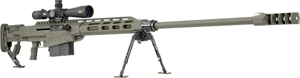 Snipex are well known for their series of precision anti-materiel rifles which includes the M100, T-Rex and Alligator. The Monomakh, introduced in 2021, is the company’s first semi-automatic rifle. It is recoil operated and feeds from a 5-round box magazine. It has a barrel 1,200mm [47.2in] long and an overall length of 2,050mm [6.7 feet], Snipex list its weight without a magazine as 25kg [55lbs]. The rifle has a listed muzzle velocity of 950 to 980 m/s and an effective range of just under 2,000 metres [1.2 miles]. The weapon is fired from a bipod with a monopod supporting the butt of the rifle. It’s key feature is its reciprocating barrel which helps soak up the recoil from the 14.5mm cartridge.