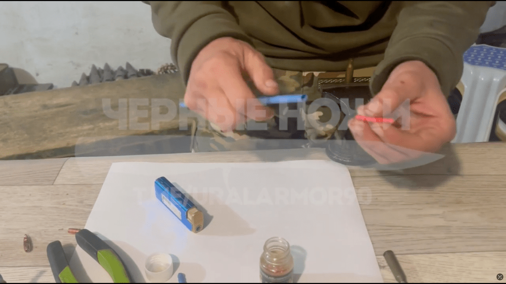 Two days later on the 14 November, a video showing the assembly of a buckshot round identical to those seen in the previous photograph was shared. A Russian combatant fills a cable sleeve with seven Crossman 4.5mm (.177) ball bearings, he heat shrinks it with a lighter and then puts the shot into another slightly wider piece of sleeve which he also heat shrinks. Then he hand seats the shot in a standard 7N6 cartridge case and uses a pair of pliers to crimp the case neck.