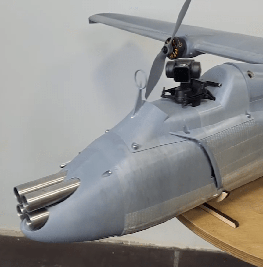 A close up of the ZigZag’s four-gun barrels and gimbal mounted camera (via Sky Defenders)