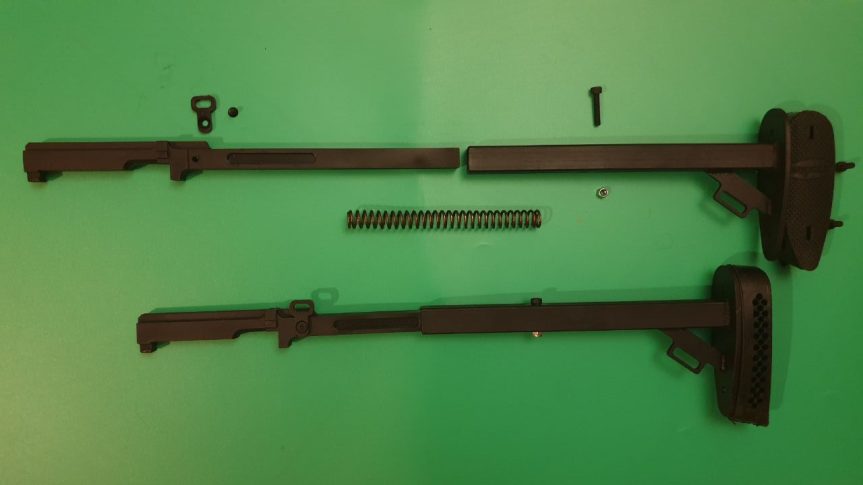 The most interesting feature of the GP-25 stock is that it has a recoil mitigation system. This appears to be a strong spring in the telescoping stock tube which acts as a buffer. The stock kit is made up of a telescoping stock with butt pad, onto which the grenade launcher is mounted – just as you would onto a rifle, a forward vertical grip can be attached by a clamshell pair of metal stampings with allow the grip piece to be centered and held in place by two cross nuts. There is also a press-fit pistol grip extension for the GP-25’s short grip to help improve ergonomics.