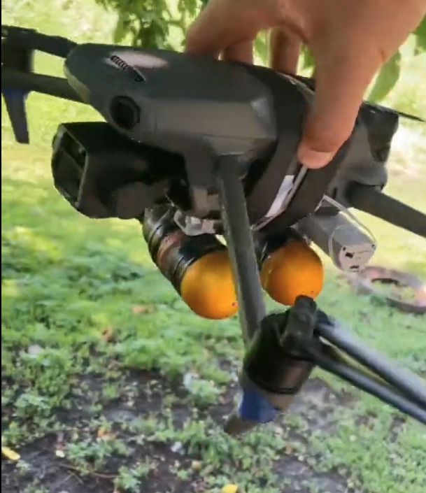 The release system appears to consist of a tray which holds the mine which is suspended by straps which are released to drop the munition. The tray can be seen swinging beneath the drone after one of the drops. The munitions appear to have tape around them, the reason for this is unclear, perhaps protecting the fuze system.
