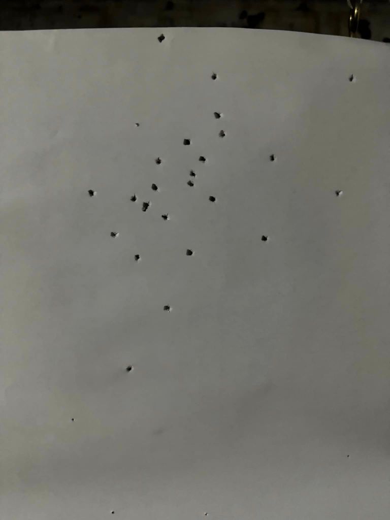 Along with the video he also posted a photograph of a target peppered with holes from small shot. The video shows the MSD-5 being fired with minimal recoil, suggesting a light load.