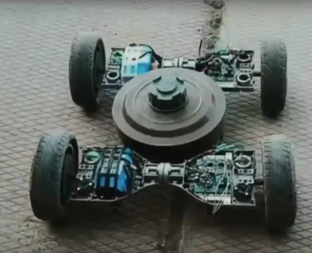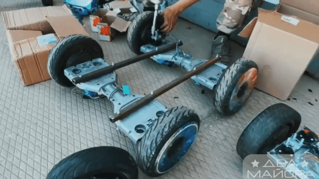 In September, another video surface which shows a pair of hoverboards with their casings removed, connected by a pair of metal braces and a board of wood which the unit’ s batteries and a control box have been mounted. In the video a Russian individual explains it can be used to carry mines up to an approximate range of 5km.