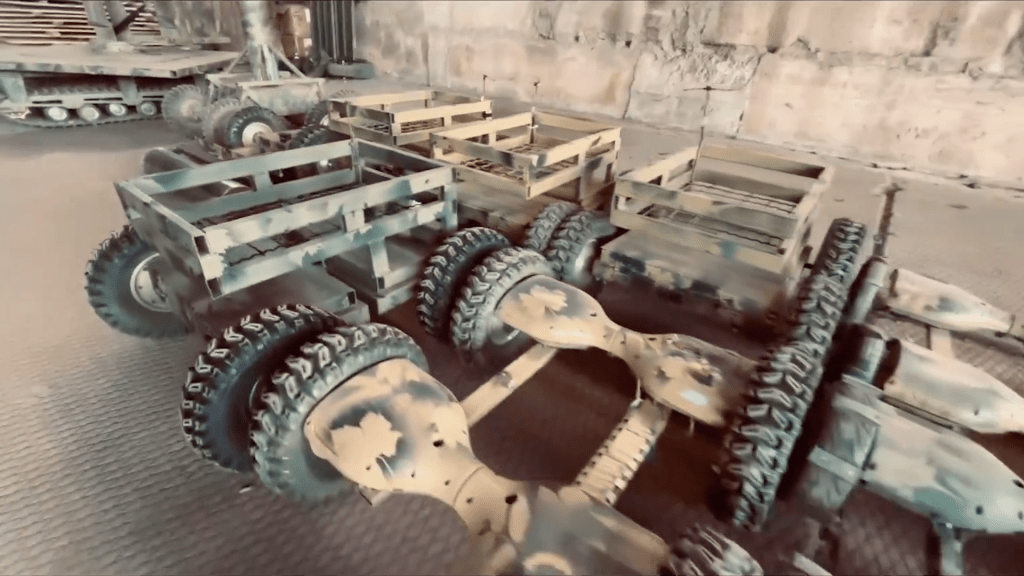 On 11 October, testing footage of a pair of small UGV was shared by the Russian telegram channel FPV_vyZOV. The clip showed two small tracked UGVs being tested in some shallow water. The video’s caption notes that the majority of the components for the drone originated in Russia but that motors and components from Hoverboards were acquired from China. The drone is reportedly able to carry up to 100kg of payload.